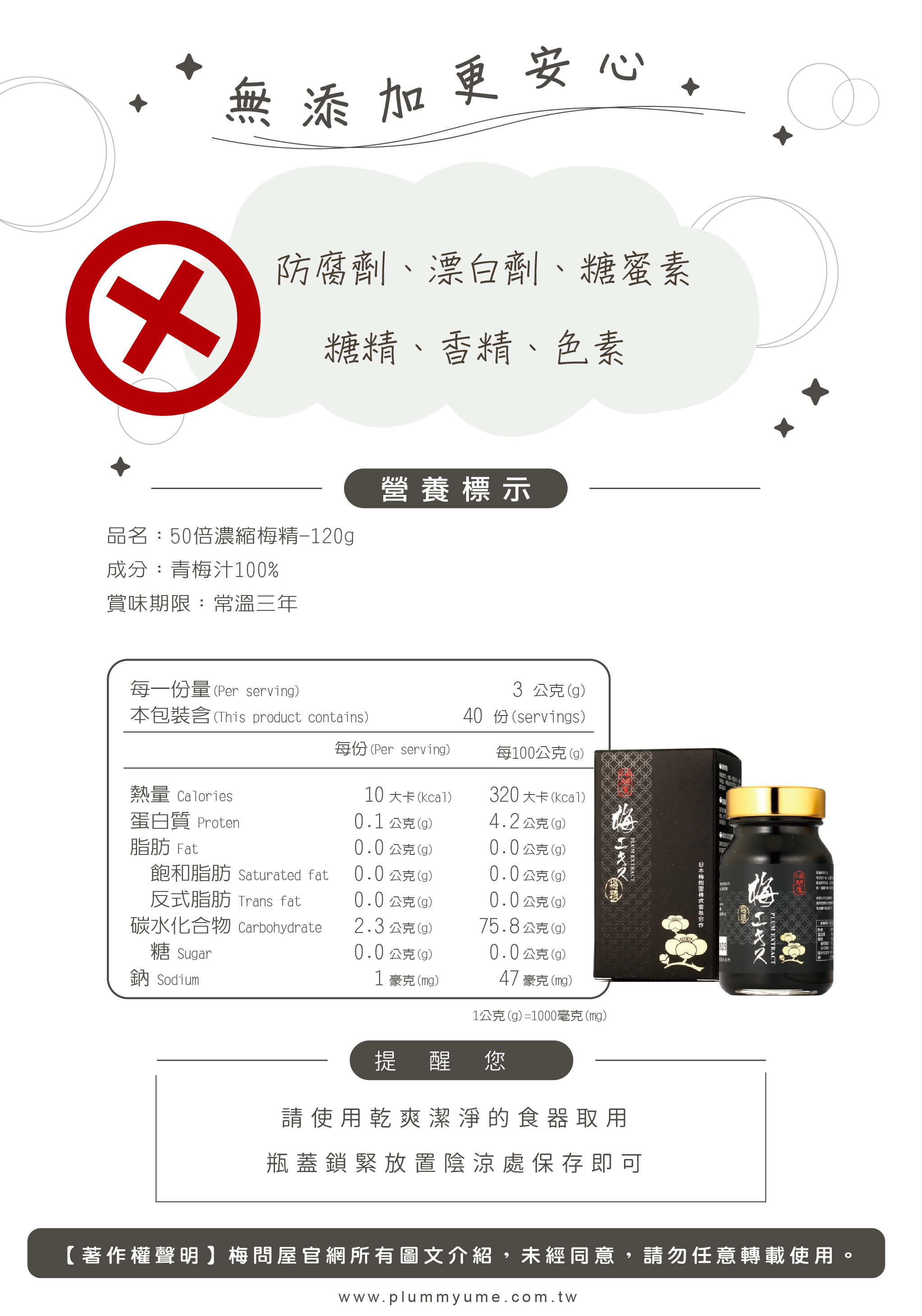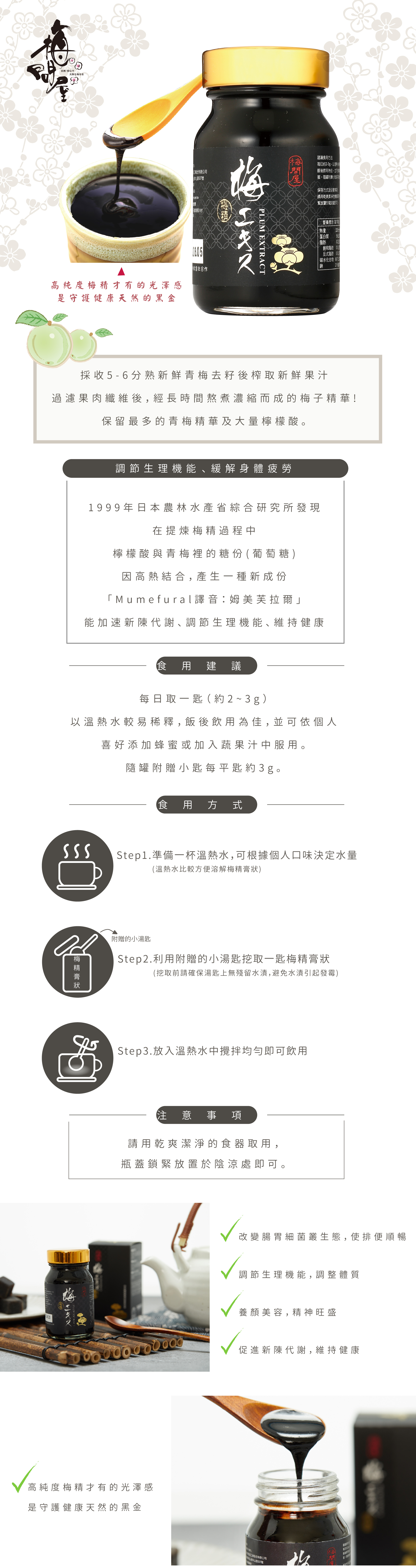 採收台灣5-6分熟新鮮青梅去籽榨汁提煉,過濾果肉纖維後,經長時間熬煮濃縮而成的梅子精華,保留最多的梅子精華與大量檸檬酸礦物質;無添加防腐劑、香料、色素...等