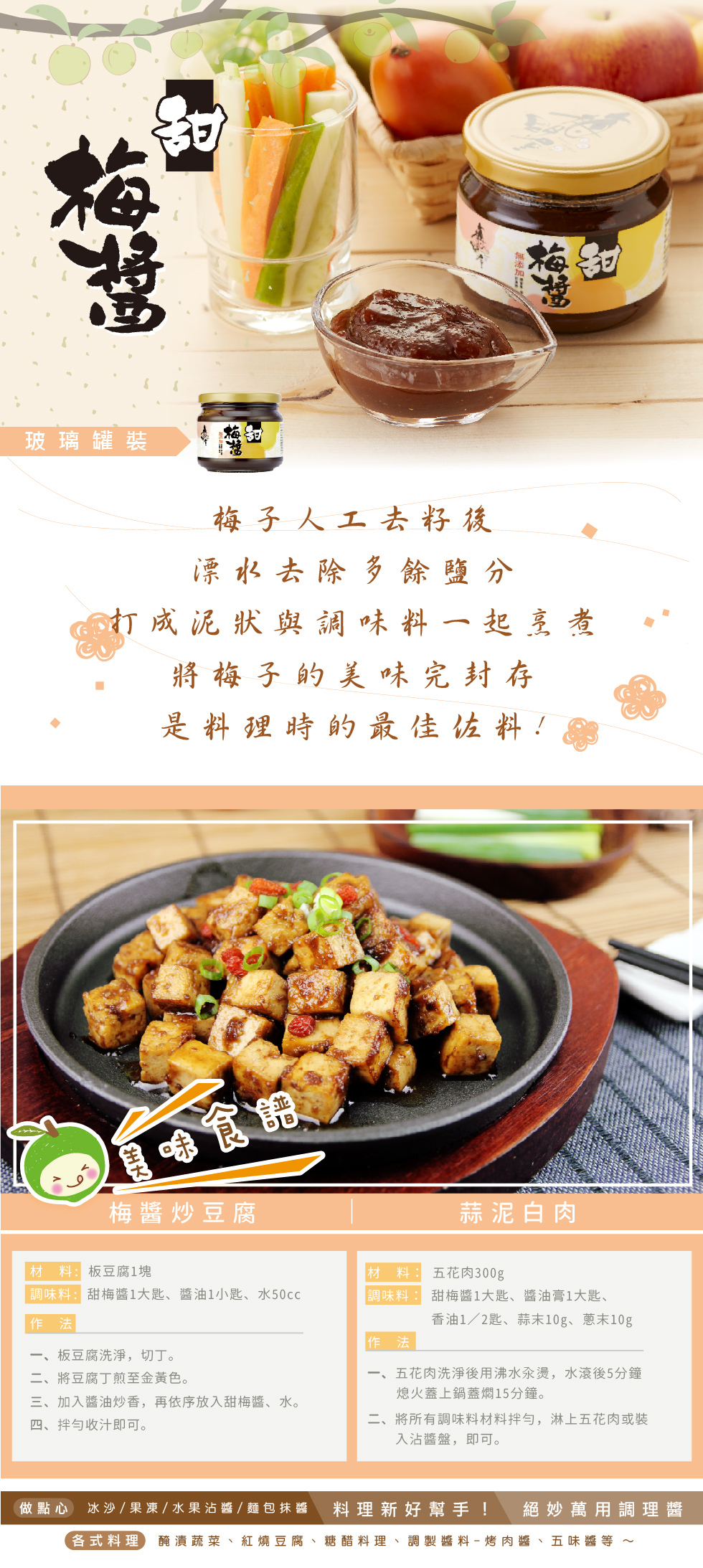 梅子在收成後,使用大量鹽巴醃漬保存,將日曬退鹽後的梅子,經手工一顆顆去籽後,打成泥狀,更方便料理使用;無添加防腐劑、香料、色素...等