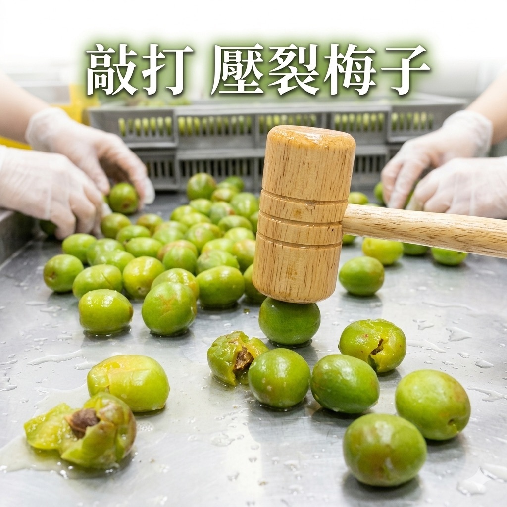 將青梅輕輕壓裂,讓果肉形成細微裂口,使漂水時更容易退去苦澀,也讓後續糖漬時糖分能慢慢滲入果肉。