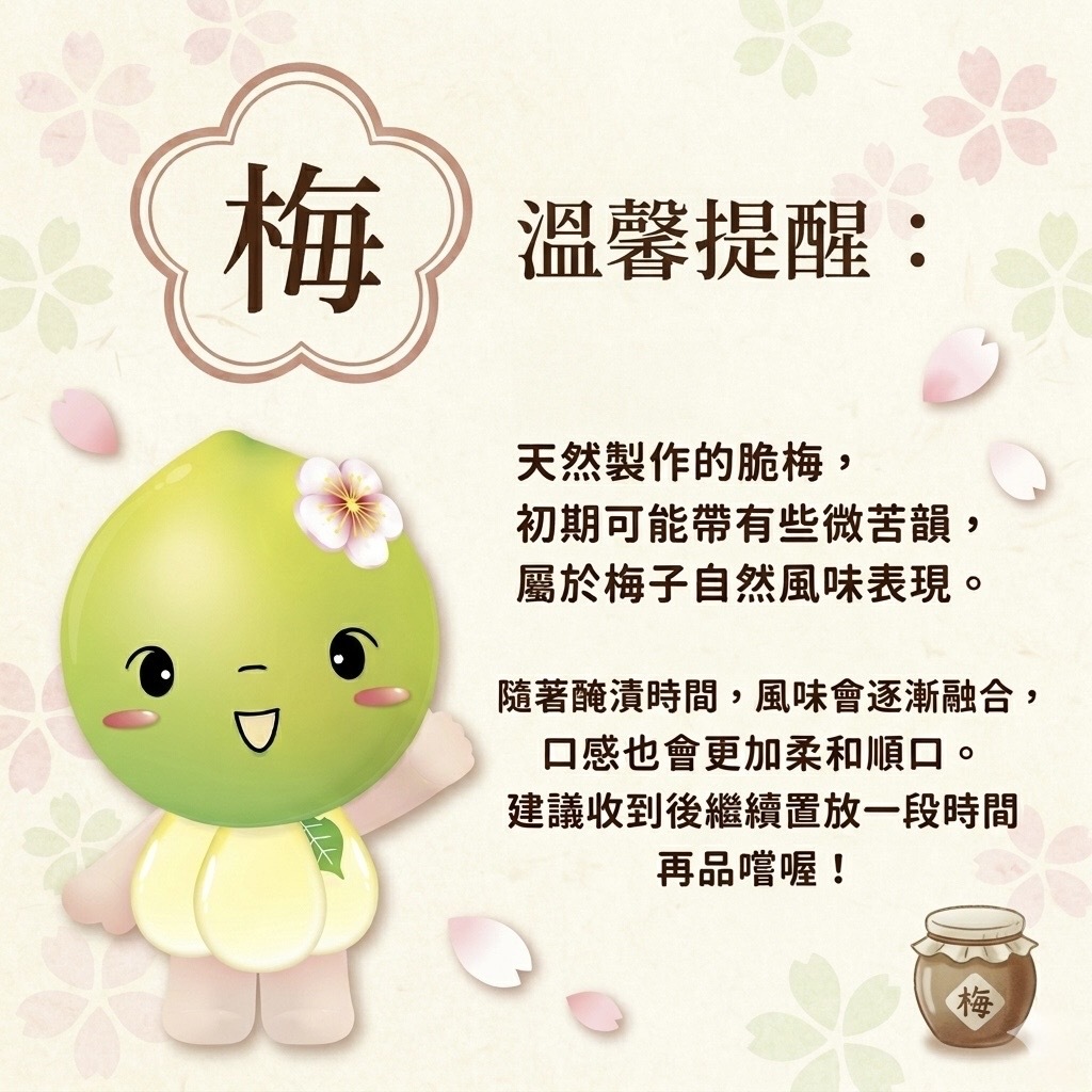溫馨提醒:天然方法製作的脆梅還會稍帶苦澀味是正常現象,會隨著醃漬的時間越久澀味會越淡