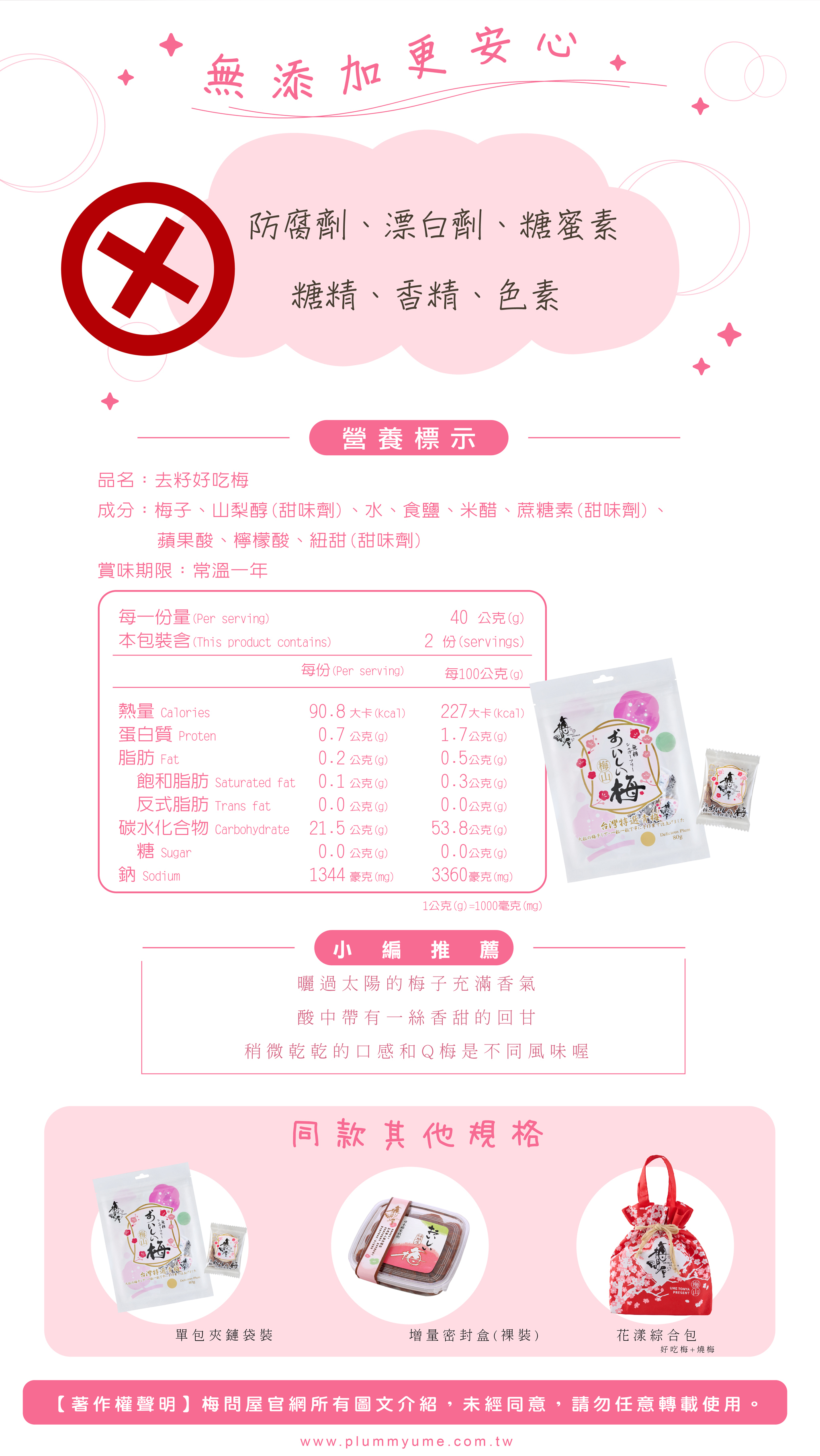 全台獨家口味,在足夠的日曬下,透出梅子天然的香氣,仔細品嘗日曬後的梅子散發出獨特香氣,梅子最原始的香味會慢慢從梅肉中散出,無糖無籽,吃得更安心無負擔;無添加防腐劑、糖精、糖蜜素、色素、香精