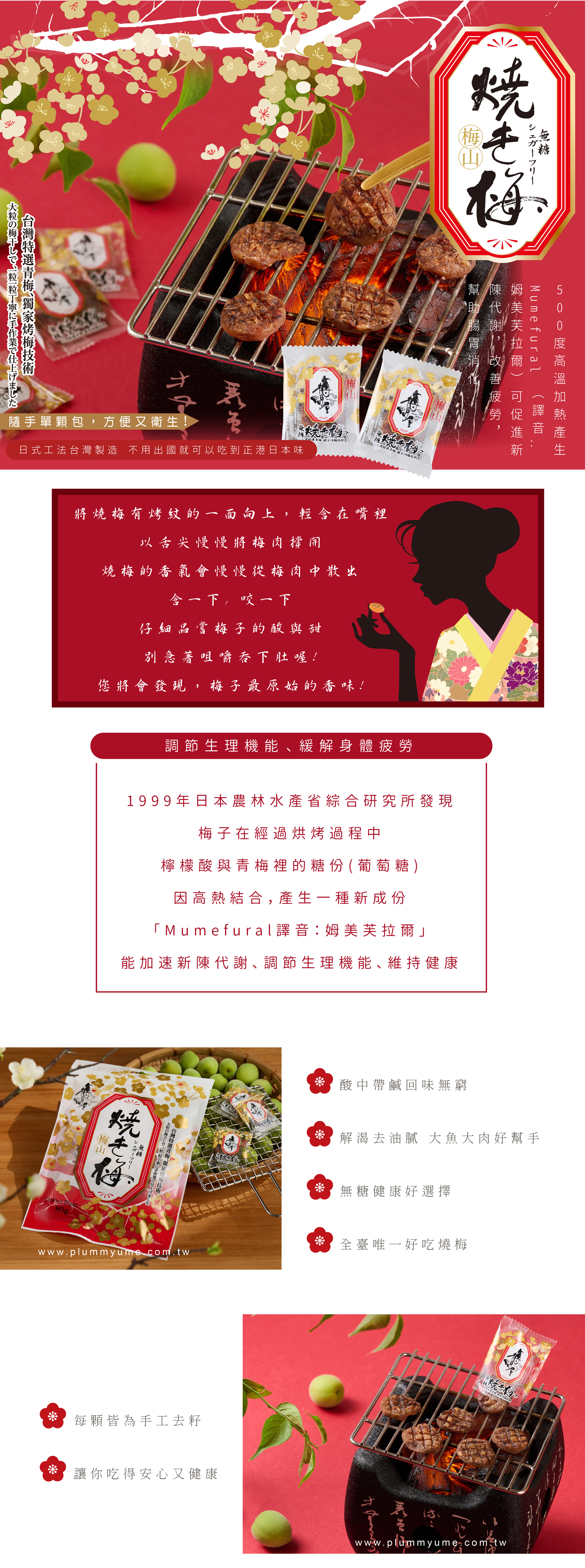 使用台灣在地青梅,鹽漬日曬後,經500度瞬間高溫加熱,梅子裡的檸檬酸與糖分(葡萄糖),因高熱結合而產生新成份「Mumefural 譯音:姆美芙拉爾」能促進新陳代謝、幫助維持消化道機能、調整體質。 烤過後的梅子表面有著獨特的烤紋,輕含在嘴裡慢慢咀嚼,燒梅的香氣會慢慢從梅肉中散出,您將會發現,梅子最原始的香味,沒有防腐劑、糖精、糖蜜素、無加糖、無籽,吃得安心無負擔。