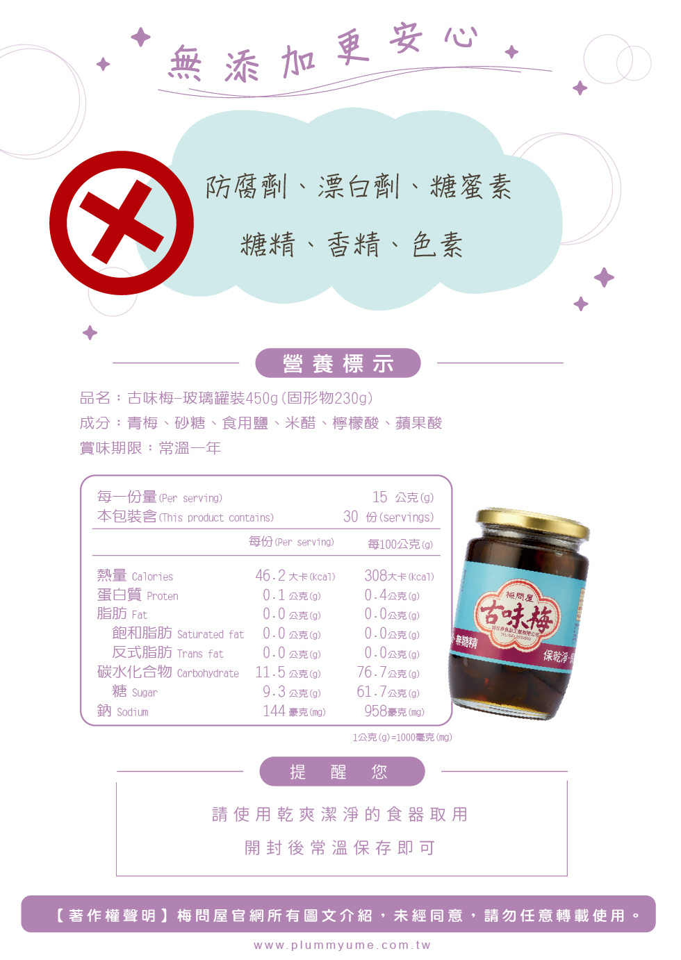 品名:古味梅-玻璃罐裝450g(固形物230g)