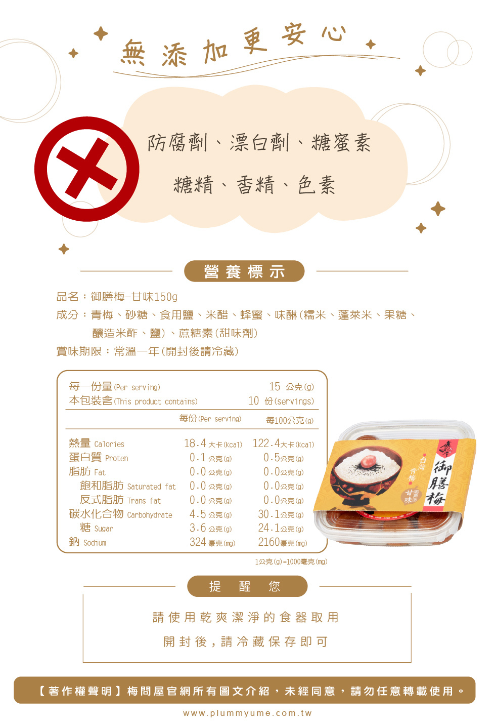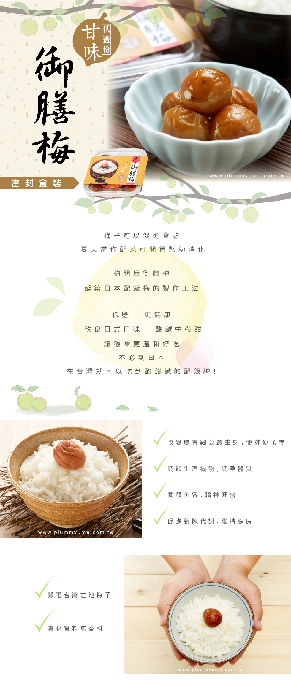 古早便當來一顆,勝過山珍與海味,吃飯配梅子,下飯又健康,不那麼鹹、不那麼酸,適合台灣人口味的御膳梅;無添加防腐劑、香料、色素...等