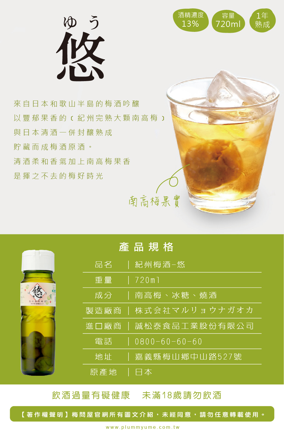 品名:紀州梅酒 悠(內含梅肉果實)