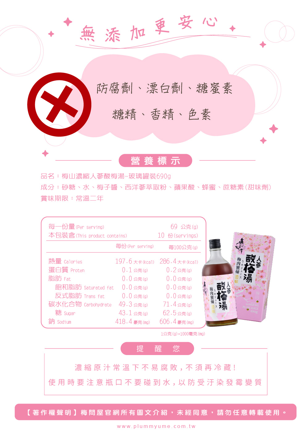 品名:梅山濃縮人蔘酸梅湯-玻璃罐裝690g