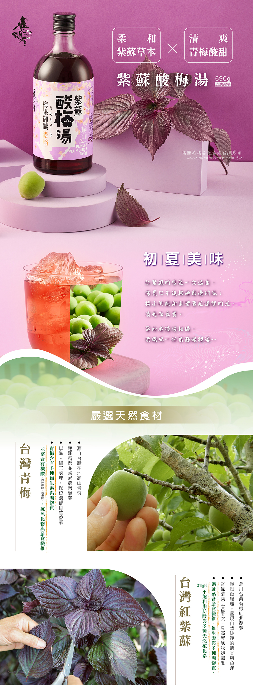 選用台灣青梅,熬煮成濃郁甜梅汁,再加入紅紫蘇葉提升香氣層次。全程不加防腐劑、糖精、糖蜜素、色素、香料,風味自然乾淨,喝得到酸梅與紫蘇的原汁原味,有別於一般市售酸梅湯,口感不黏膩、冷熱皆宜,是全家安心享用的清爽飲品。
