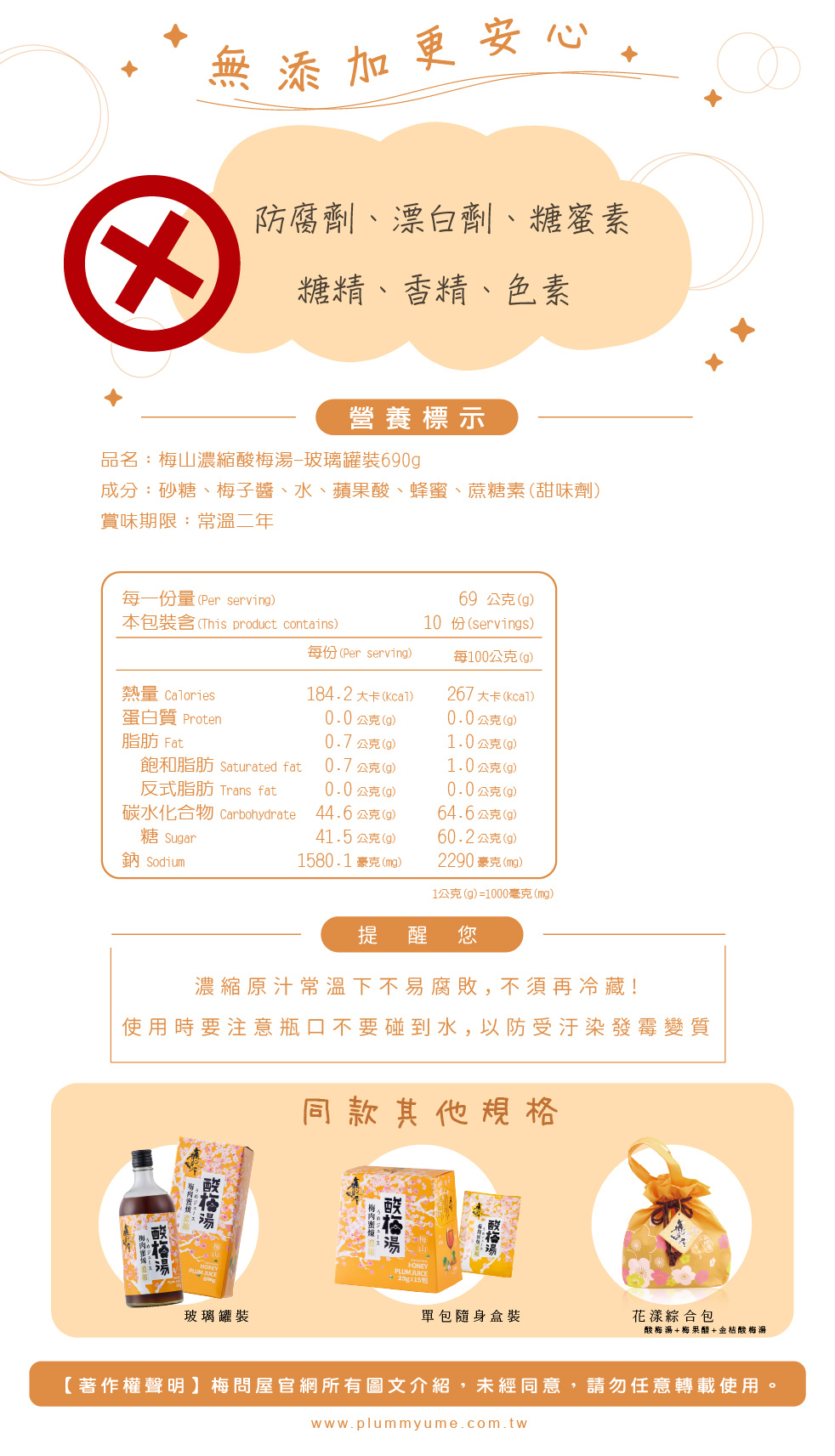 清新梅子香與濃郁蜂蜜香,加上梅子果肉熬煮, 清爽滋味顛覆味蕾,無論熱熱喝還是加冰塊都非常美味;無添加防腐劑、香料、色素...等