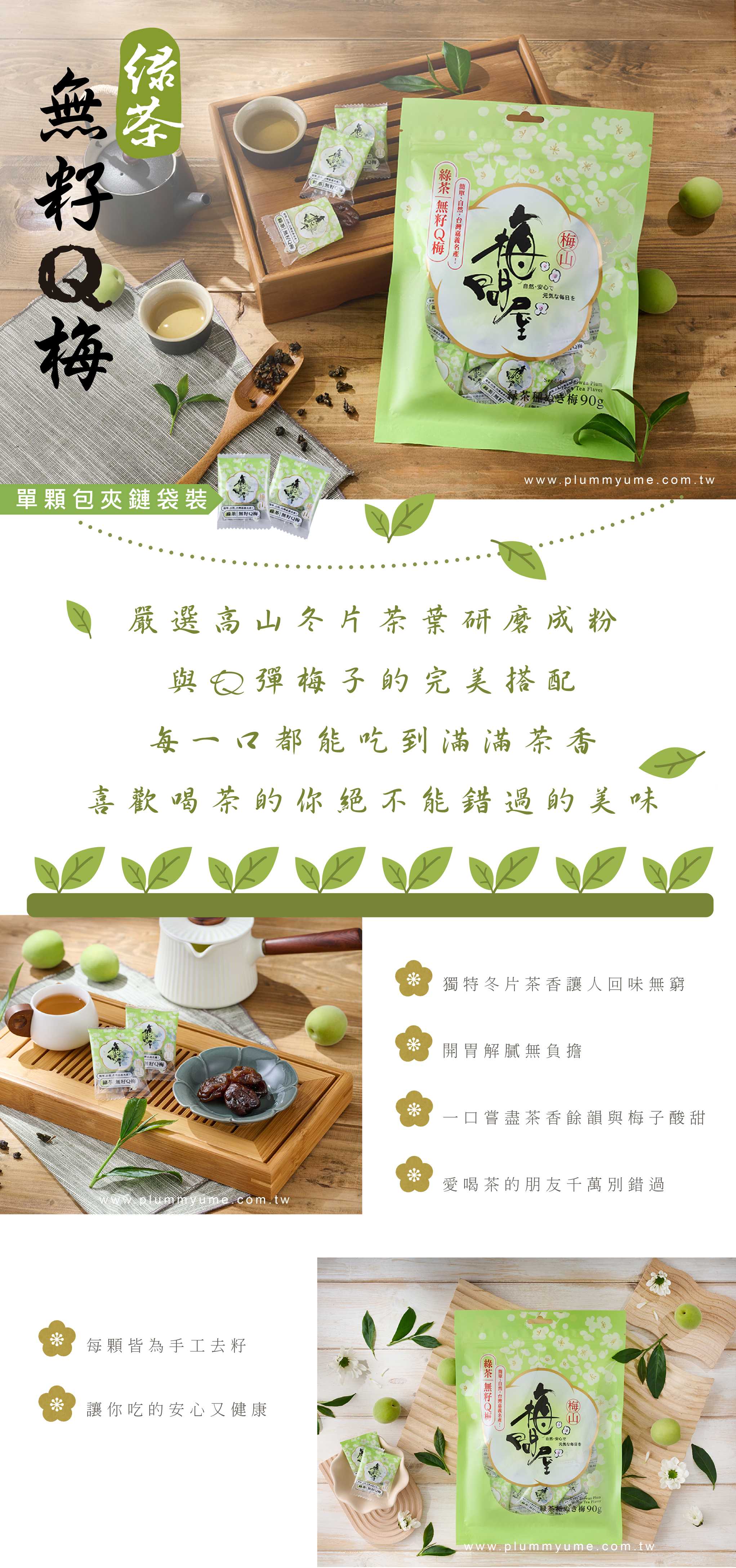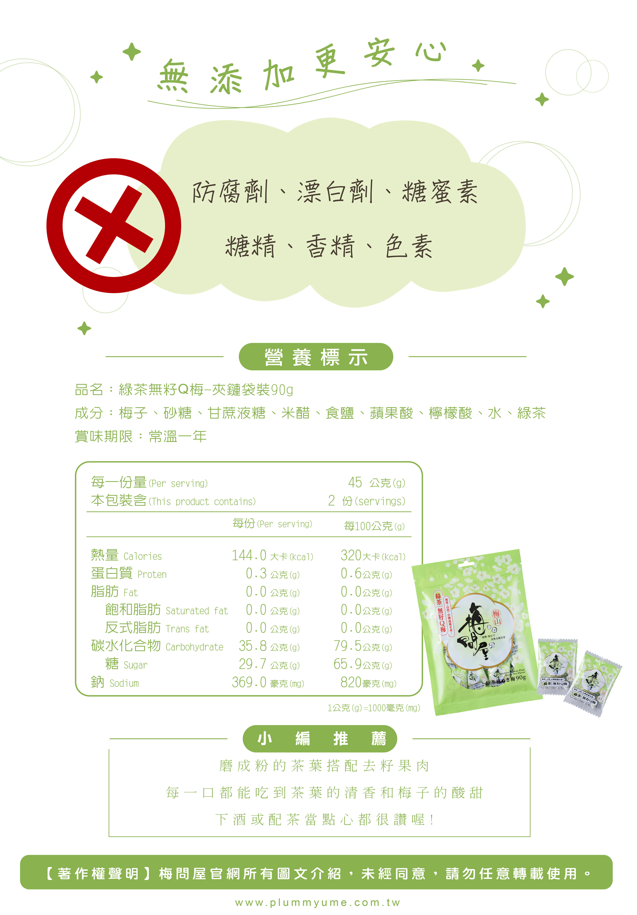 成分:梅子、砂糖、甘蔗液糖、米醋、食鹽、蘋果酸、檸檬酸、水、綠茶