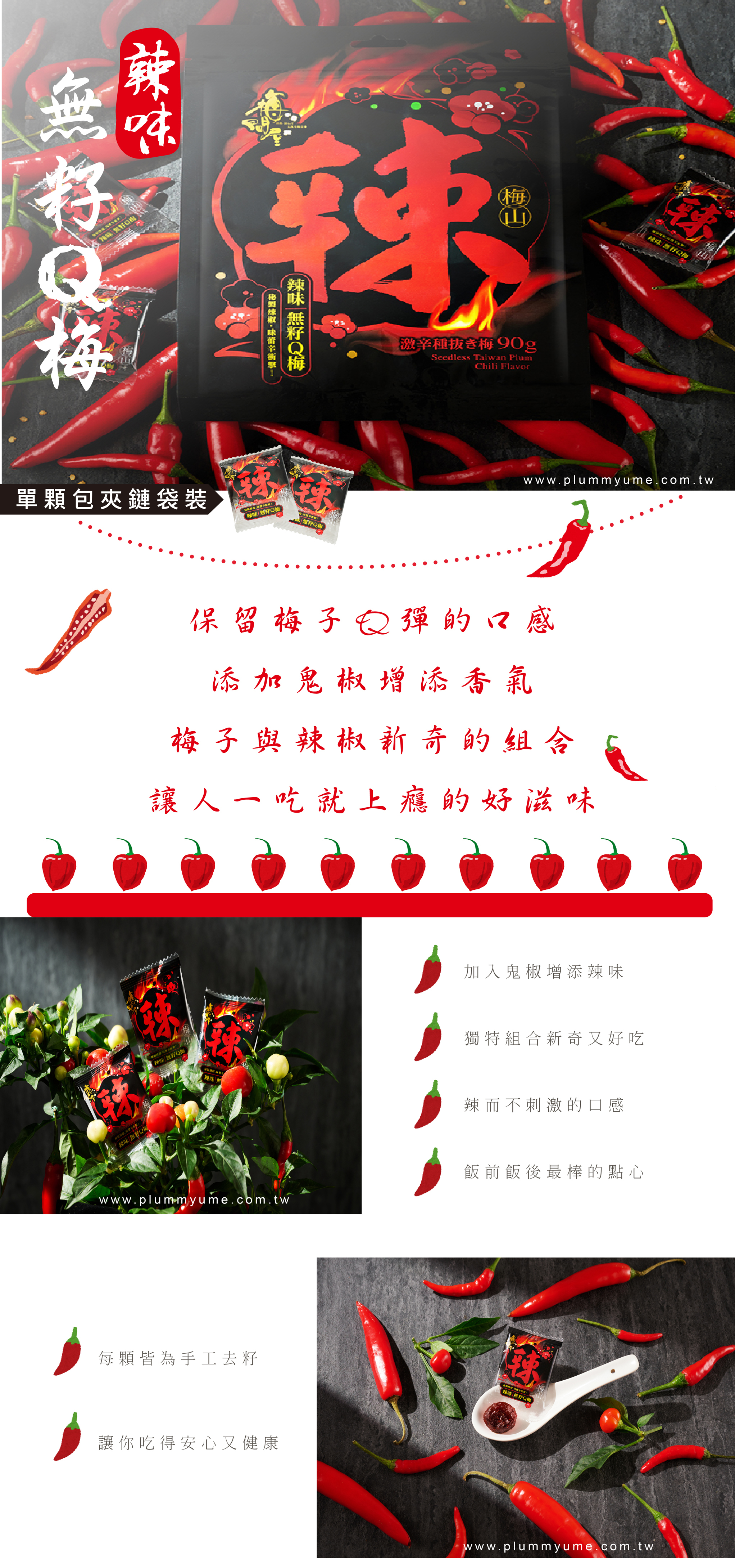 嚴選台灣在地青梅,通過農藥殘留檢測,每一顆都是手工去籽,吃得安全又安心。保留梅子的香味,加入鬼椒增添辣味,梅子與辣椒的組合新奇又美味,讓人一吃就上癮!