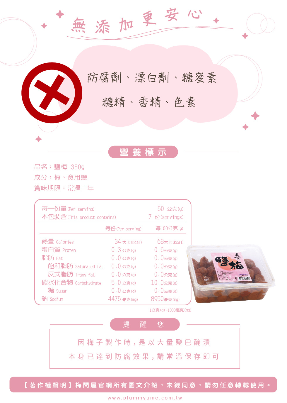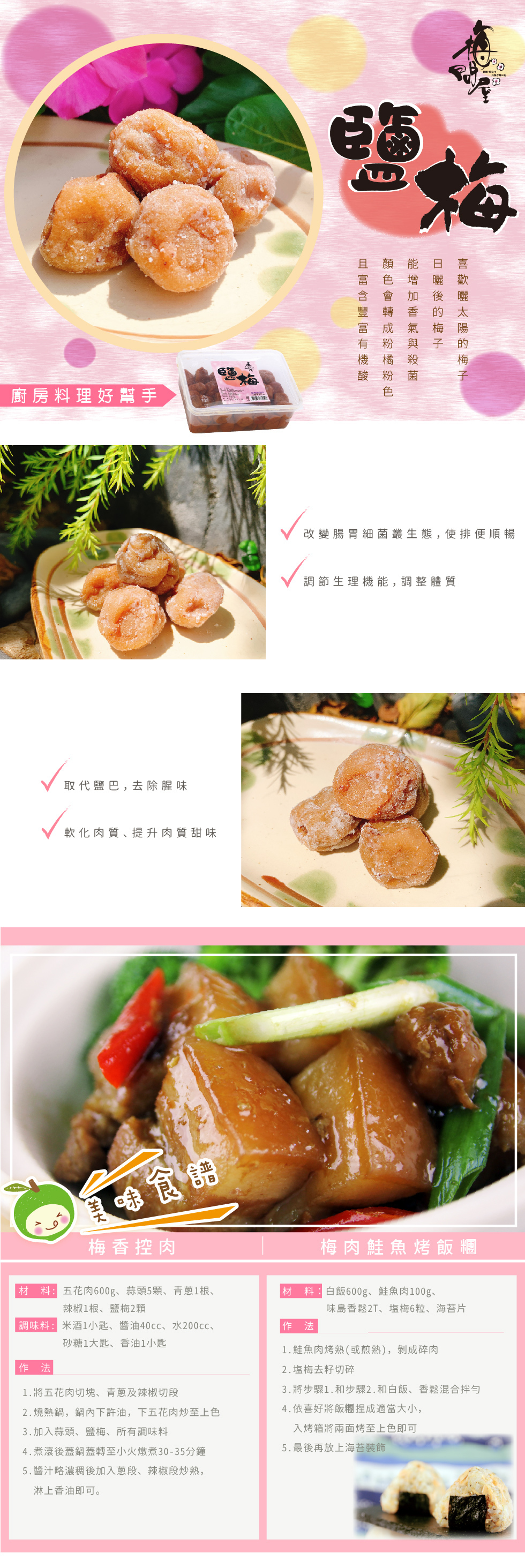 梅子在收成後,使用大量鹽巴醃漬保存,日曬後的鹽梅胚能增加香氣與殺菌,且富凡豐富有機酸;無添加防腐劑、香料、色素...等
